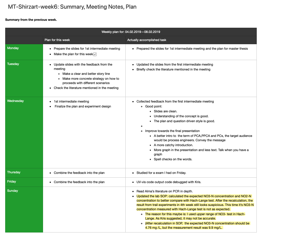 However, with all these plans implemented, My supervisor still had the impression that I didn’t have a plan. It means something went wrong in my execution. Having a plan doesn’t guarantee success. You need to be able to execute it, measure it, reflect on each week’s process, and improve on it.