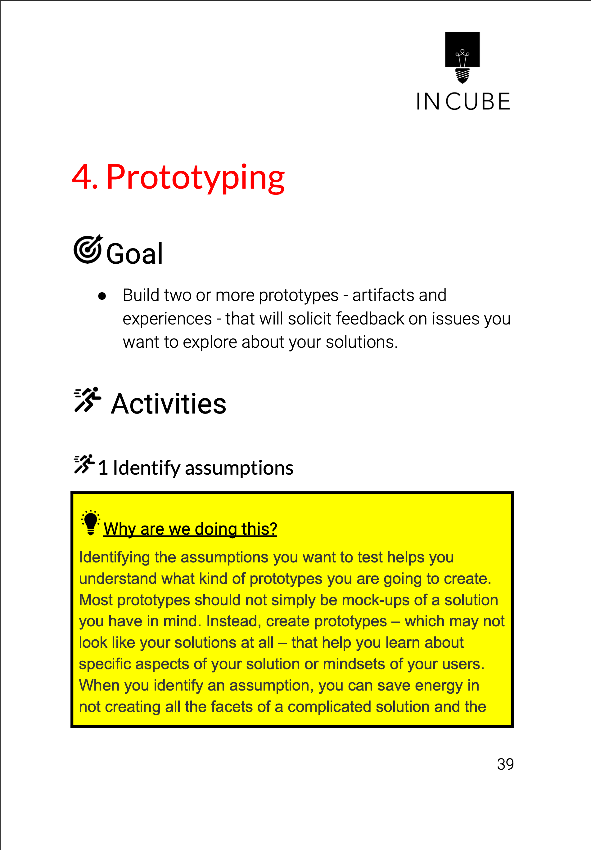 This guide book was divided into sections according to InCube schedule. As the workshop progress, multiple tool kits and explanation of the exercise is provided to help Design Thinking workshop participants to stay engaged, stay energised and come up with the best solution they can for the challenge.